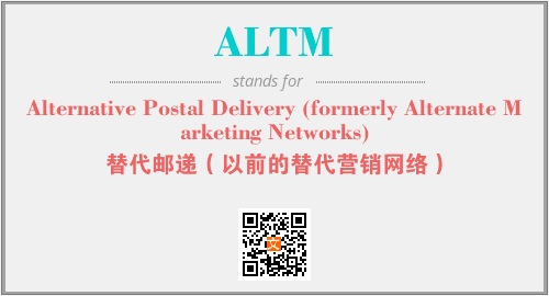 英文缩略词“ALTM”经常作为“Alternative Postal Delivery (formerly Alternate Marketing Networks)”的英文缩写来使用,中文表示:“替代邮递(以前的替代营销网络)”。本文将详细介绍英文缩写词ALTM所代表英文单词,其对应的中文拼音、详细解释以及在英语中的流行度。此外,还有关于缩略词ALTM的分类、应用领域及相关应用示例等。