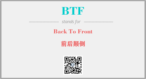 上述内容是“Back To Front”作为“BTF”的缩写,解释为“前后颠倒”时的信息,以及英文缩略词BTF所代表的英文单词,其对应的中文拼音、详细解释以及在英文中的流行度和相关分类、应用领域及应用示例等。