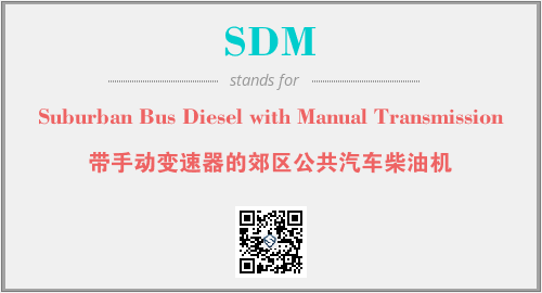 上述内容是“Suburban Bus Diesel with Manual Transmission”作为“SDM”的缩写,解释为“带手动变速器的郊区公共汽车柴油机”时的信息,以及英文缩略词SDM所代表的英文单词,其对应的中文拼音、详细解释以及在英文中的流行度和相关分类、应用领域及应用示例等。