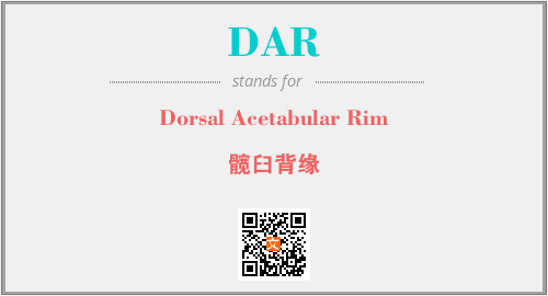 上述内容是“Dorsal Acetabular Rim”作为“DAR”的缩写,解释为“髋臼背缘”时的信息,以及英文缩略词DAR所代表的英文单词,其对应的中文拼音、详细解释以及在英文中的流行度和相关分类、应用领域及应用示例等。