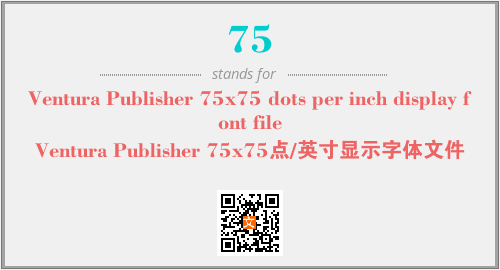上述内容是“Ventura Publisher 75x75 dots per inch display font file”作为“75”的缩写,解释为“Ventura Publisher 75x75点/英寸显示字体文件”时的信息,以及英文缩略词75所代表的英文单词,其对应的中文拼音、详细解释以及在英文中的流行度和相关分类、应用领域及应用示例等。