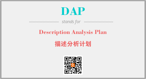 上述内容是“Description Analysis Plan”作为“DAP”的缩写,解释为“描述分析计划”时的信息,以及英文缩略词DAP所代表的英文单词,其对应的中文拼音、详细解释以及在英文中的流行度和相关分类、应用领域及应用示例等。