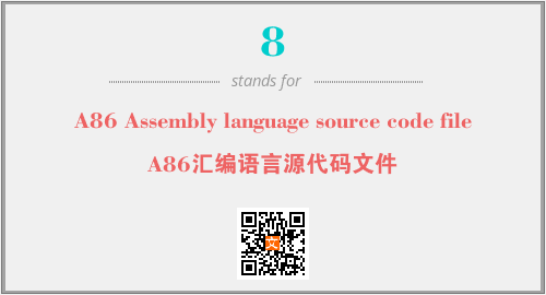 上述内容是“A86 Assembly language source code file”作为“8”的缩写,解释为“A86汇编语言源代码文件”时的信息,以及英文缩略词8所代表的英文单词,其对应的中文拼音、详细解释以及在英文中的流行度和相关分类、应用领域及应用示例等。