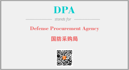 英文缩略词“DPA”经常作为“Defense Procurement Agency”的英文缩写来使用,中文表示:“国防采购局”。本文将详细介绍英文缩写词DPA所代表英文单词,其对应的中文拼音、详细解释以及在英语中的流行度。此外,还有关于缩略词DPA的分类、应用领域及相关应用示例等。