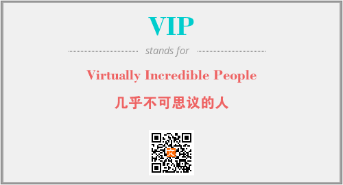 上述内容是“Virtually Incredible People”作为“VIP”的缩写,解释为“几乎不可思议的人”时的信息,以及英文缩略词VIP所代表的英文单词,其对应的中文拼音、详细解释以及在英文中的流行度和相关分类、应用领域及应用示例等。