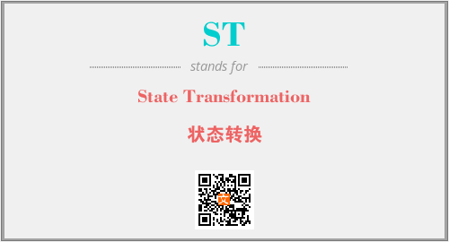 英文缩略词“ST”经常作为“State Transformation”的英文缩写来使用,中文表示:“状态转换”。本文将详细介绍英文缩写词ST所代表英文单词,其对应的中文拼音、详细解释以及在英语中的流行度。此外,还有关于缩略词ST的分类、应用领域及相关应用示例等。
