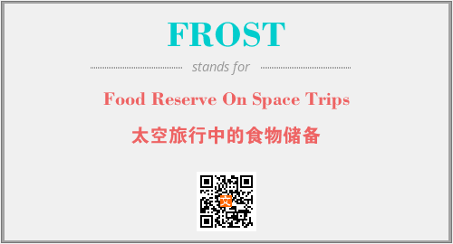 上述内容是“Food Reserve On Space Trips”作为“FROST”的缩写,解释为“太空旅行中的食物储备”时的信息,以及英文缩略词FROST所代表的英文单词,其对应的中文拼音、详细解释以及在英文中的流行度和相关分类、应用领域及应用示例等。