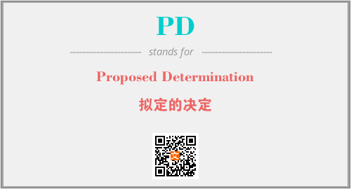 上述内容是“Proposed Determination”作为“PD”的缩写,解释为“拟定的决定”时的信息,以及英文缩略词PD所代表的英文单词,其对应的中文拼音、详细解释以及在英文中的流行度和相关分类、应用领域及应用示例等。