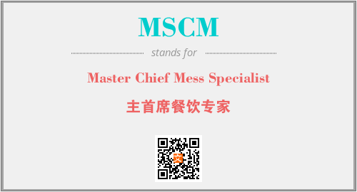 英文缩略词“MSCM”经常作为“Master Chief Mess Specialist”的英文缩写来使用,中文表示:“主首席餐饮专家”。本文将详细介绍英文缩写词MSCM所代表英文单词,其对应的中文拼音、详细解释以及在英语中的流行度。此外,还有关于缩略词MSCM的分类、应用领域及相关应用示例等。