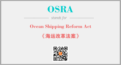 上述内容是“Ocean Shipping Reform Act”作为“OSRA”的缩写,解释为“《海运改革法案》”时的信息,以及英文缩略词OSRA所代表的英文单词,其对应的中文拼音、详细解释以及在英文中的流行度和相关分类、应用领域及应用示例等。
