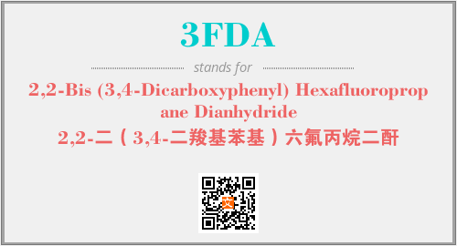 英文缩略词“3FDA”经常作为“2,2-Bis (3,4-Dicarboxyphenyl) Hexafluoropropane Dianhydride”的英文缩写来使用,中文表示:“2,2-二(3,4-二羧基苯基)六氟丙烷二酐”。本文将详细介绍英文缩写词3FDA所代表英文单词,其对应的中文拼音、详细解释以及在英语中的流行度。此外,还有关于缩略词3FDA的分类、应用领域及相关应用示例等。