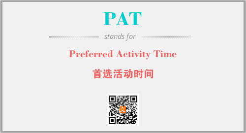 上述内容是“Preferred Activity Time”作为“PAT”的缩写,解释为“首选活动时间”时的信息,以及英文缩略词PAT所代表的英文单词,其对应的中文拼音、详细解释以及在英文中的流行度和相关分类、应用领域及应用示例等。