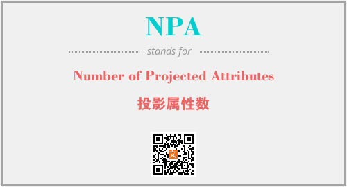 上述内容是“Number of Projected Attributes”作为“NPA”的缩写,解释为“投影属性数”时的信息,以及英文缩略词NPA所代表的英文单词,其对应的中文拼音、详细解释以及在英文中的流行度和相关分类、应用领域及应用示例等。