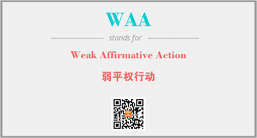 上述内容是“Weak Affirmative Action”作为“WAA”的缩写,解释为“弱平权行动”时的信息,以及英文缩略词WAA所代表的英文单词,其对应的中文拼音、详细解释以及在英文中的流行度和相关分类、应用领域及应用示例等。