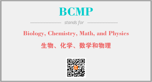 英文缩略词“BCMP”经常作为“Biology, Chemistry, Math, and Physics”的英文缩写来使用,中文表示:“生物、化学、数学和物理”。本文将详细介绍英文缩写词BCMP所代表英文单词,其对应的中文拼音、详细解释以及在英语中的流行度。此外,还有关于缩略词BCMP的分类、应用领域及相关应用示例等。