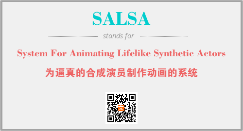 上述内容是“System For Animating Lifelike Synthetic Actors”作为“SALSA”的缩写,解释为“为逼真的合成演员制作动画的系统”时的信息,以及英文缩略词SALSA所代表的英文单词,其对应的中文拼音、详细解释以及在英文中的流行度和相关分类、应用领域及应用示例等。