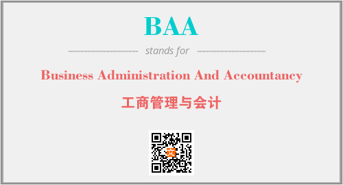 英文缩略词“BAA”经常作为“Business Administration And Accountancy”的英文缩写来使用,中文表示:“工商管理与会计”。本文将详细介绍英文缩写词BAA所代表英文单词,其对应的中文拼音、详细解释以及在英语中的流行度。此外,还有关于缩略词BAA的分类、应用领域及相关应用示例等。