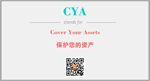 上述内容是“Cover Your Assets”作为“CYA”的缩写,解释为“保护您的资产”时的信息,以及英文缩略词CYA所代表的英文单词,其对应的中文拼音、详细解释以及在英文中的流行度和相关分类、应用领域及应用示例等。