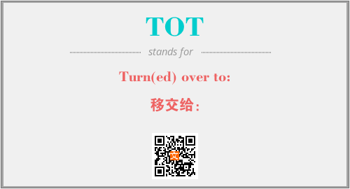 英文缩略词“TOT”经常作为“Turn(ed) over to:”的英文缩写来使用,中文表示:“移交给:”。本文将详细介绍英文缩写词TOT所代表英文单词,其对应的中文拼音、详细解释以及在英语中的流行度。此外,还有关于缩略词TOT的分类、应用领域及相关应用示例等。