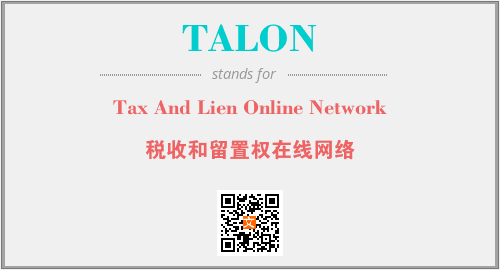 英文缩略词“TALON”经常作为“Tax And Lien Online Network”的英文缩写来使用,中文表示:“税收和留置权在线网络”。本文将详细介绍英文缩写词TALON所代表英文单词,其对应的中文拼音、详细解释以及在英语中的流行度。此外,还有关于缩略词TALON的分类、应用领域及相关应用示例等。