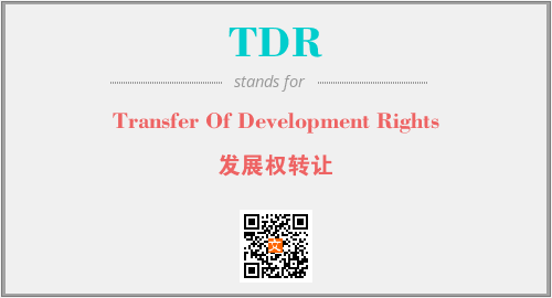 英文缩略词“TDR”经常作为“Transfer Of Development Rights”的英文缩写来使用,中文表示:“发展权转让”。本文将详细介绍英文缩写词TDR所代表英文单词,其对应的中文拼音、详细解释以及在英语中的流行度。此外,还有关于缩略词TDR的分类、应用领域及相关应用示例等。