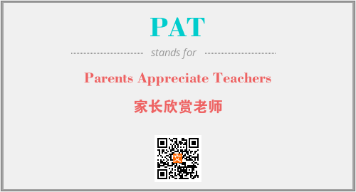 以上为Parents Appreciate Teachers英文缩略词PAT的中文解释,以及该英文缩写在英语的流行度、分类和应用领域方面的信息。