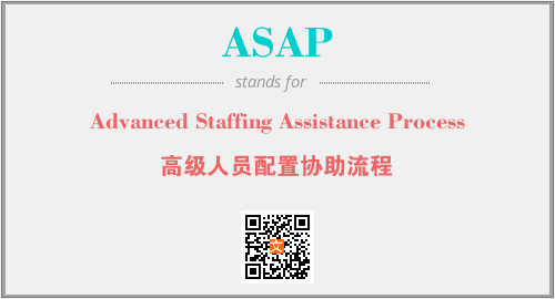 英文缩略词“ASAP”经常作为“Advanced Staffing Assistance Process”的英文缩写来使用,中文表示:“高级人员配置协助流程”。本文将详细介绍英文缩写词ASAP所代表英文单词,其对应的中文拼音、详细解释以及在英语中的流行度。此外,还有关于缩略词ASAP的分类、应用领域及相关应用示例等。