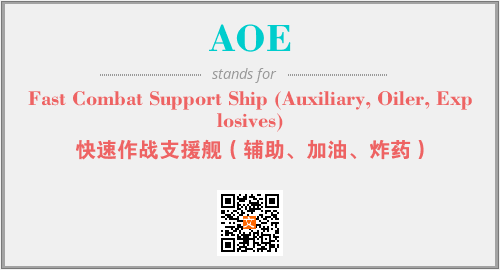 上述内容是“Fast Combat Support Ship (Auxiliary, Oiler, Explosives)”作为“AOE”的缩写,解释为“快速作战支援舰(辅助、加油、炸药)”时的信息,以及英文缩略词AOE所代表的英文单词,其对应的中文拼音、详细解释以及在英文中的流行度和相关分类、应用领域及应用示例等。