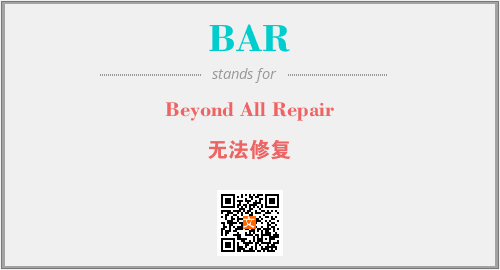 上述内容是“Beyond All Repair”作为“BAR”的缩写,解释为“无法修复”时的信息,以及英文缩略词BAR所代表的英文单词,其对应的中文拼音、详细解释以及在英文中的流行度和相关分类、应用领域及应用示例等。