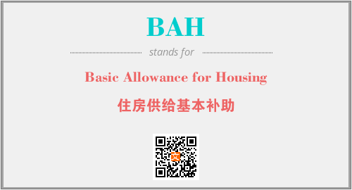 英文缩略词“BAH”经常作为“Basic Allowance for Housing”的英文缩写来使用,中文表示:“住房供给基本补助”。本文将详细介绍英文缩写词BAH所代表英文单词,其对应的中文拼音、详细解释以及在英语中的流行度。此外,还有关于缩略词BAH的分类、应用领域及相关应用示例等。