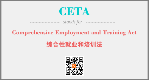 英文缩略词“CETA”经常作为“Comprehensive Employment and Training Act”的英文缩写来使用,中文表示:“综合性就业和培训法”。本文将详细介绍英文缩写词CETA所代表英文单词,其对应的中文拼音、详细解释以及在英语中的流行度。此外,还有关于缩略词CETA的分类、应用领域及相关应用示例等。