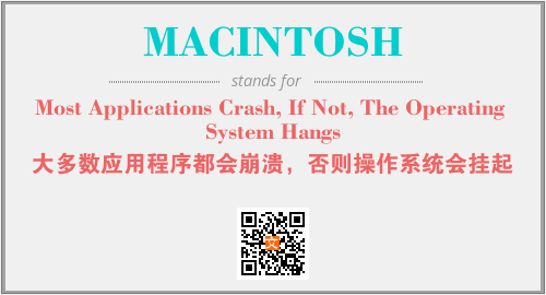 上述内容是“Most Applications Crash, If Not, The Operating System Hangs”作为“MACINTOSH”的缩写,解释为“大多数应用程序都会崩溃,否则操作系统会挂起”时的信息,以及英文缩略词MACINTOSH所代表的英文单词,其对应的中文拼音、详细解释以及在英文中的流行度和相关分类、应用领域及应用示例等。