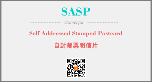 英文缩略词“SASP”经常作为“Self Addressed Stamped Postcard”的英文缩写来使用,中文表示:“自封邮票明信片”。本文将详细介绍英文缩写词SASP所代表英文单词,其对应的中文拼音、详细解释以及在英语中的流行度。此外,还有关于缩略词SASP的分类、应用领域及相关应用示例等。