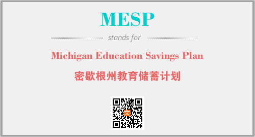 上述内容是“Michigan Education Savings Plan”作为“MESP”的缩写,解释为“密歇根州教育储蓄计划”时的信息,以及英文缩略词MESP所代表的英文单词,其对应的中文拼音、详细解释以及在英文中的流行度和相关分类、应用领域及应用示例等。