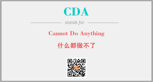 英文缩略词“CDA”经常作为“Cannot Do Anything”的英文缩写来使用,中文表示:“什么都做不了”。本文将详细介绍英文缩写词CDA所代表英文单词,其对应的中文拼音、详细解释以及在英语中的流行度。此外,还有关于缩略词CDA的分类、应用领域及相关应用示例等。