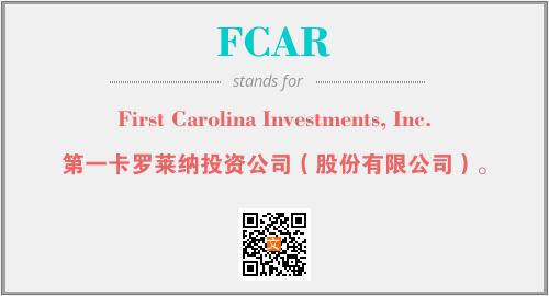 上述内容是“First Carolina Investments, Inc.”作为“FCAR”的缩写,解释为“第一卡罗莱纳投资公司(股份有限公司)。”时的信息,以及英文缩略词FCAR所代表的英文单词,其对应的中文拼音、详细解释以及在英文中的流行度和相关分类、应用领域及应用示例等。