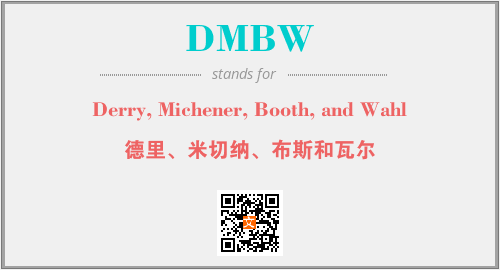 上述内容是“Derry, Michener, Booth, and Wahl”作为“DMBW”的缩写,解释为“德里、米切纳、布斯和瓦尔”时的信息,以及英文缩略词DMBW所代表的英文单词,其对应的中文拼音、详细解释以及在英文中的流行度和相关分类、应用领域及应用示例等。