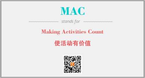上述内容是“Making Activities Count”作为“MAC”的缩写,解释为“使活动有价值”时的信息,以及英文缩略词MAC所代表的英文单词,其对应的中文拼音、详细解释以及在英文中的流行度和相关分类、应用领域及应用示例等。