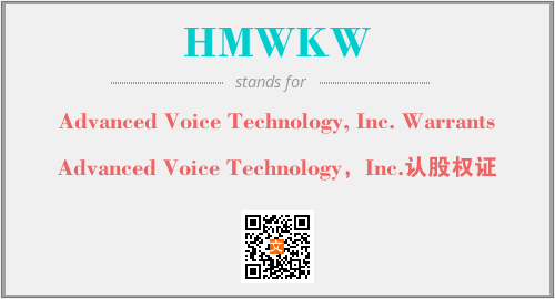 上述内容是“Advanced Voice Technology, Inc. Warrants”作为“HMWKW”的缩写,解释为“Advanced Voice Technology,Inc.认股权证”时的信息,以及英文缩略词HMWKW所代表的英文单词,其对应的中文拼音、详细解释以及在英文中的流行度和相关分类、应用领域及应用示例等。