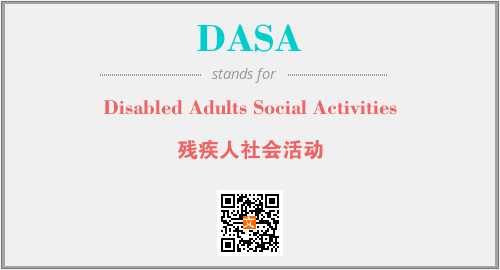 上述内容是“Disabled Adults Social Activities”作为“DASA”的缩写,解释为“残疾人社会活动”时的信息,以及英文缩略词DASA所代表的英文单词,其对应的中文拼音、详细解释以及在英文中的流行度和相关分类、应用领域及应用示例等。