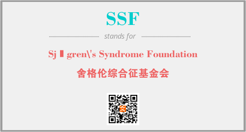 上述内容是“Sjögren\'s Syndrome Foundation”作为“SSF”的缩写,解释为“舍格伦综合征基金会”时的信息,以及英文缩略词SSF所代表的英文单词,其对应的中文拼音、详细解释以及在英文中的流行度和相关分类、应用领域及应用示例等。