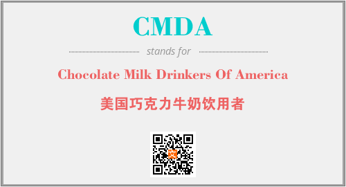 英文缩略词“CMDA”经常作为“Chocolate Milk Drinkers Of America”的英文缩写来使用,中文表示:“美国巧克力牛奶饮用者”。本文将详细介绍英文缩写词CMDA所代表英文单词,其对应的中文拼音、详细解释以及在英语中的流行度。此外,还有关于缩略词CMDA的分类、应用领域及相关应用示例等。