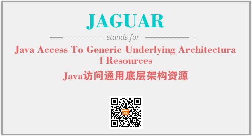 上述内容是“Java Access To Generic Underlying Architectural Resources”作为“JAGUAR”的缩写,解释为“Java访问通用底层架构资源”时的信息,以及英文缩略词JAGUAR所代表的英文单词,其对应的中文拼音、详细解释以及在英文中的流行度和相关分类、应用领域及应用示例等。