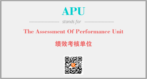 上述内容是“The Assessment Of Performance Unit”作为“APU”的缩写,解释为“绩效考核单位”时的信息,以及英文缩略词APU所代表的英文单词,其对应的中文拼音、详细解释以及在英文中的流行度和相关分类、应用领域及应用示例等。