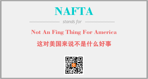 上述内容是“Not An Fing Thing For America”作为“NAFTA”的缩写,解释为“这对美国来说不是什么好事”时的信息,以及英文缩略词NAFTA所代表的英文单词,其对应的中文拼音、详细解释以及在英文中的流行度和相关分类、应用领域及应用示例等。