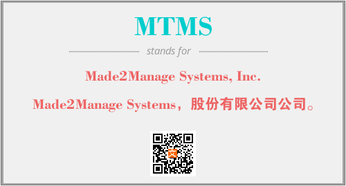 上述内容是“Made2Manage Systems, Inc.”作为“MTMS”的缩写,解释为“Made2Manage Systems,股份有限公司公司。”时的信息,以及英文缩略词MTMS所代表的英文单词,其对应的中文拼音、详细解释以及在英文中的流行度和相关分类、应用领域及应用示例等。