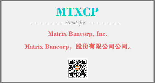上述内容是“Matrix Bancorp, Inc.”作为“MTXCP”的缩写,解释为“Matrix Bancorp,股份有限公司公司。”时的信息,以及英文缩略词MTXCP所代表的英文单词,其对应的中文拼音、详细解释以及在英文中的流行度和相关分类、应用领域及应用示例等。