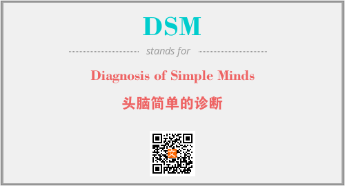 英文缩略词“DSM”经常作为“Diagnosis of Simple Minds”的英文缩写来使用,中文表示:“头脑简单的诊断”。本文将详细介绍英文缩写词DSM所代表英文单词,其对应的中文拼音、详细解释以及在英语中的流行度。此外,还有关于缩略词DSM的分类、应用领域及相关应用示例等。