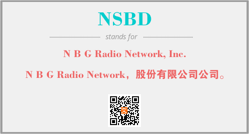 上述内容是“N B G Radio Network, Inc.”作为“NSBD”的缩写,解释为“N B G Radio Network,股份有限公司公司。”时的信息,以及英文缩略词NSBD所代表的英文单词,其对应的中文拼音、详细解释以及在英文中的流行度和相关分类、应用领域及应用示例等。