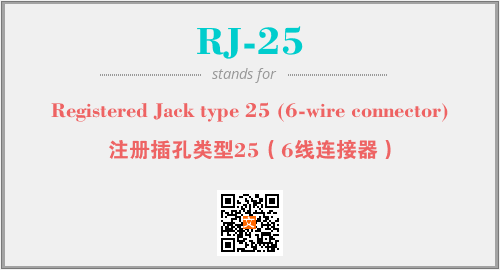 英文缩略词“RJ-25”经常作为“Registered Jack type 25 (6-wire connector)”的英文缩写来使用,中文表示:“注册插孔类型25(6线连接器)”。本文将详细介绍英文缩写词RJ-25所代表英文单词,其对应的中文拼音、详细解释以及在英语中的流行度。此外,还有关于缩略词RJ-25的分类、应用领域及相关应用示例等。